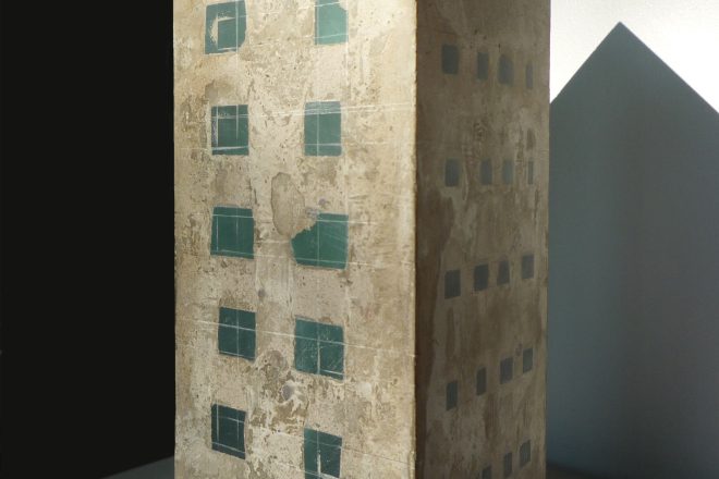 In this piece, stained and polished concrete is pierced through with glass blocks, etched with lines to emphasise the windows, which allow Light to traverse the sculpture: Small House Series #70